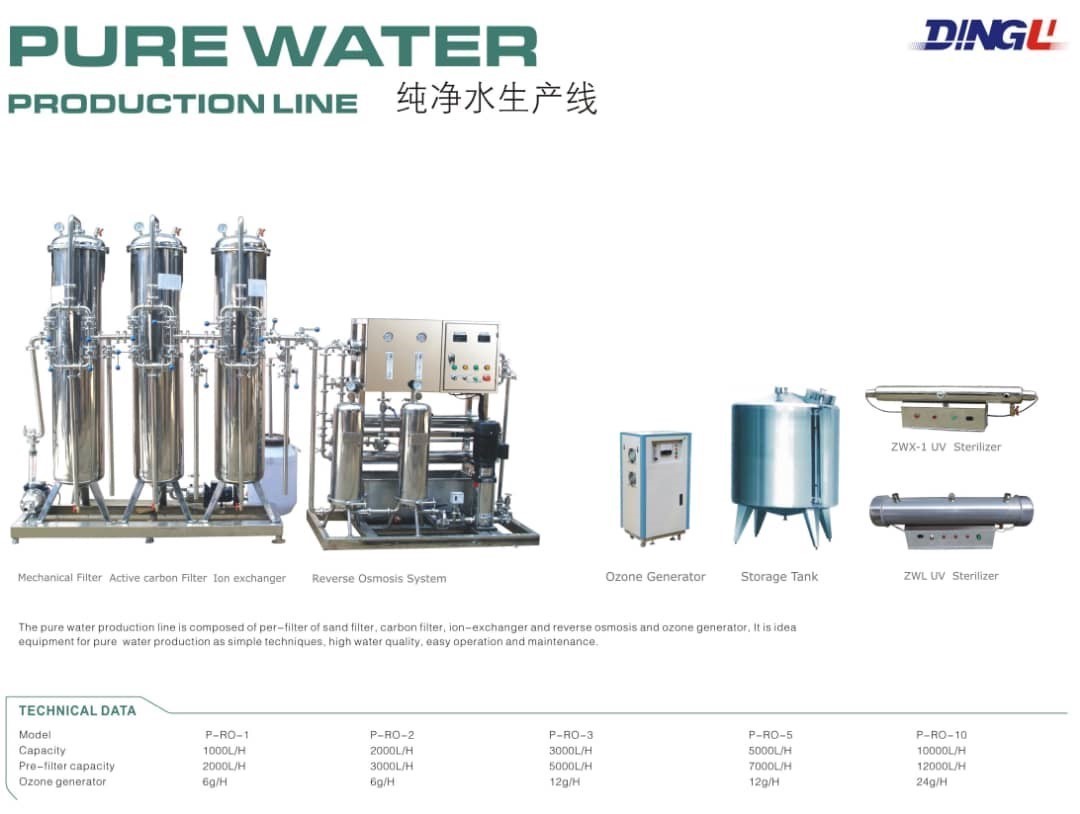 Pure Water Production Line is designed for producing pure water and includes components such as a pre-filter, sand filter, carbon filter, ion-exchanger, reverse osmosis system, and an ozone generator.